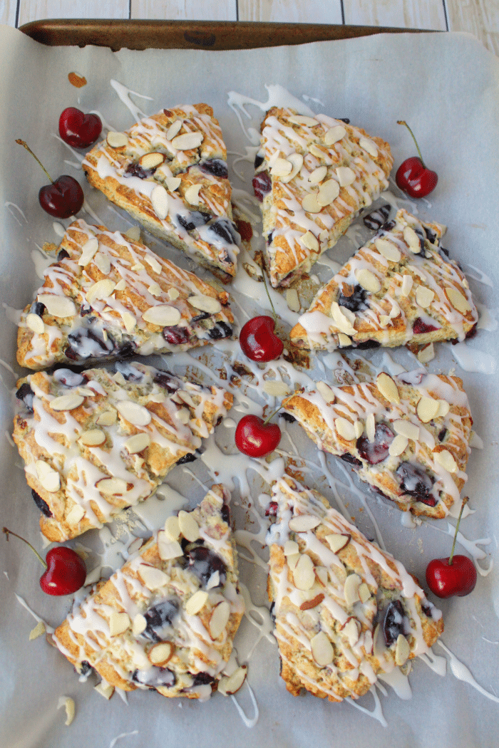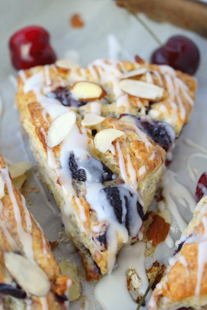 Loaded with sweet chunks of fresh cherries, lots of sliced almonds, and a delicious almond-cream cheese glaze, these scones are amazing for breakfast!